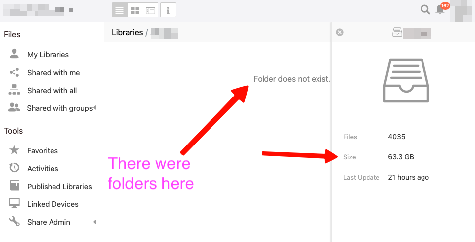 - If you want to check all libraries, you can omit the ID. After the process completes, restart Seafile and check if the folders reappeared for the admin account.