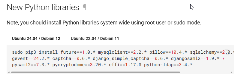 - Similarly, and more problematic, the exact list of Python modules needed per version and per OS version. For example, the version of Pillow specified for Seafile 11 throws an error when installed on Debian 13. One Debian 12 the packages throw depreciation errors (yes I appreciate this is why docker is attractive)
