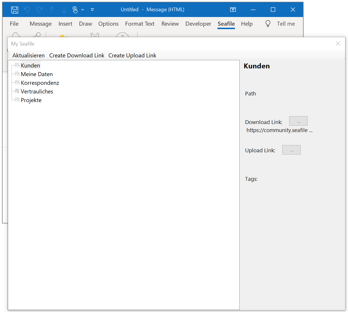 Integrate your favorite File Collaboration solution Seafile and Microsoft Outlook with the new Seafile add-in for Microsoft Outlook. A ready-for-testing version is now available for download at Plugin Integration | Seafile The add-in was developed by datamate, European Seafile Partner, and freelance developer Simon Giesen.
