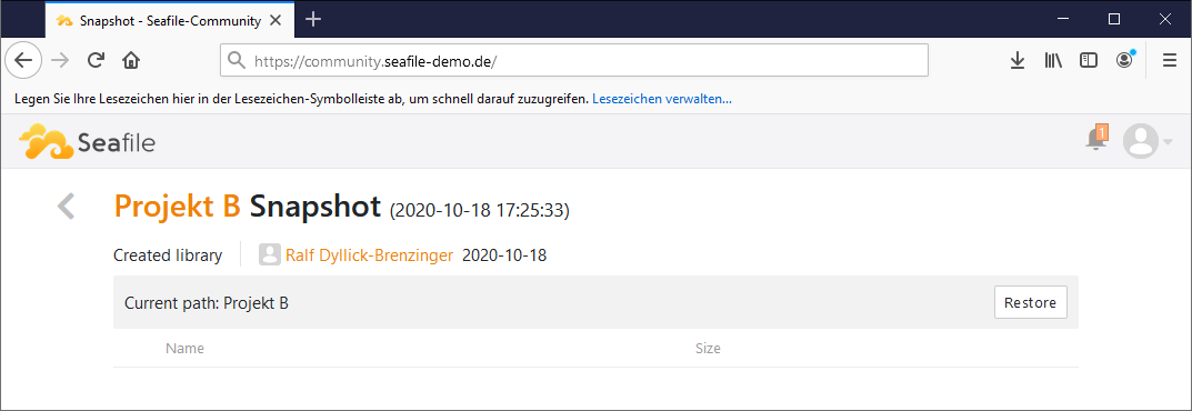 A snapshot restore in Seafile CE 7.1.5 is possible: