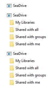 What you can do to remove the stranded icons is this: Look for the string “seadrive” in HKEY_ROOT\CLSID of you windows registry. You will find at least three keys containing that string. Each one is responsible for one of the nodes in the nav bar. Look closer at these keys: There will be a value IsPinnedToNameTree = 1. Set this value to 0 and check if the node has disappeared.