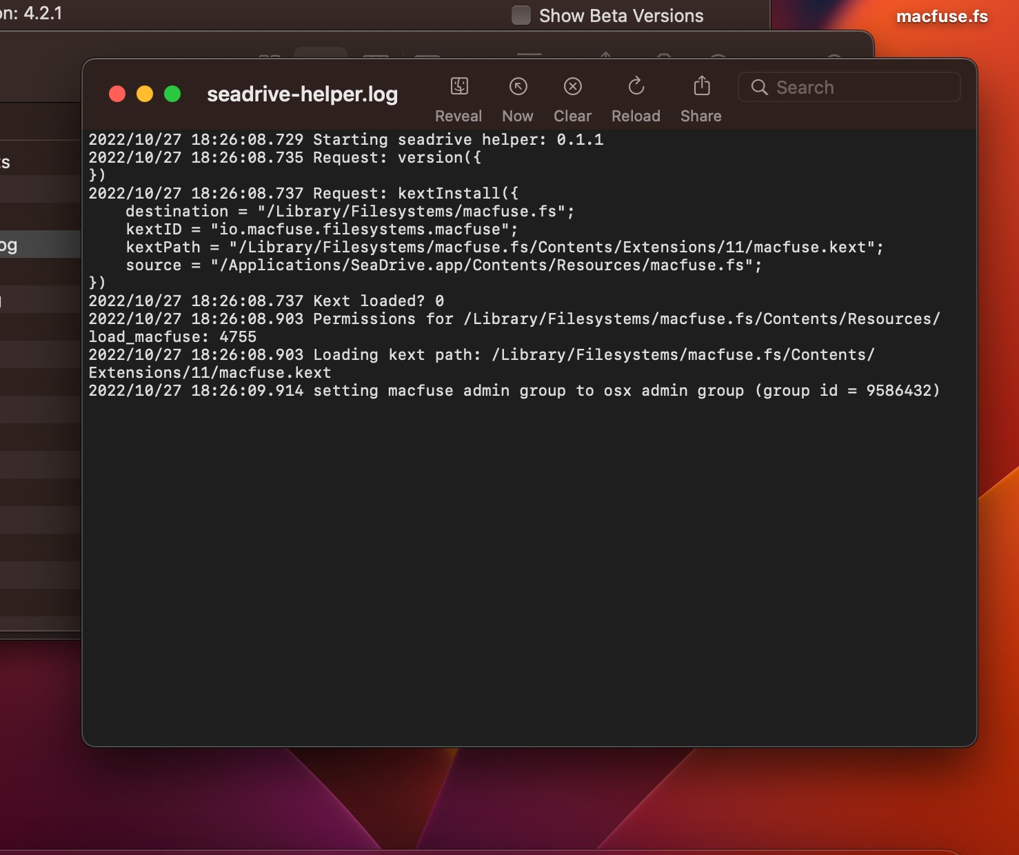 Recently I updated my MacBook Pro (M1) to MacOS 13.0 beta, then the Seadrive crashed with the error information shown in the figure
