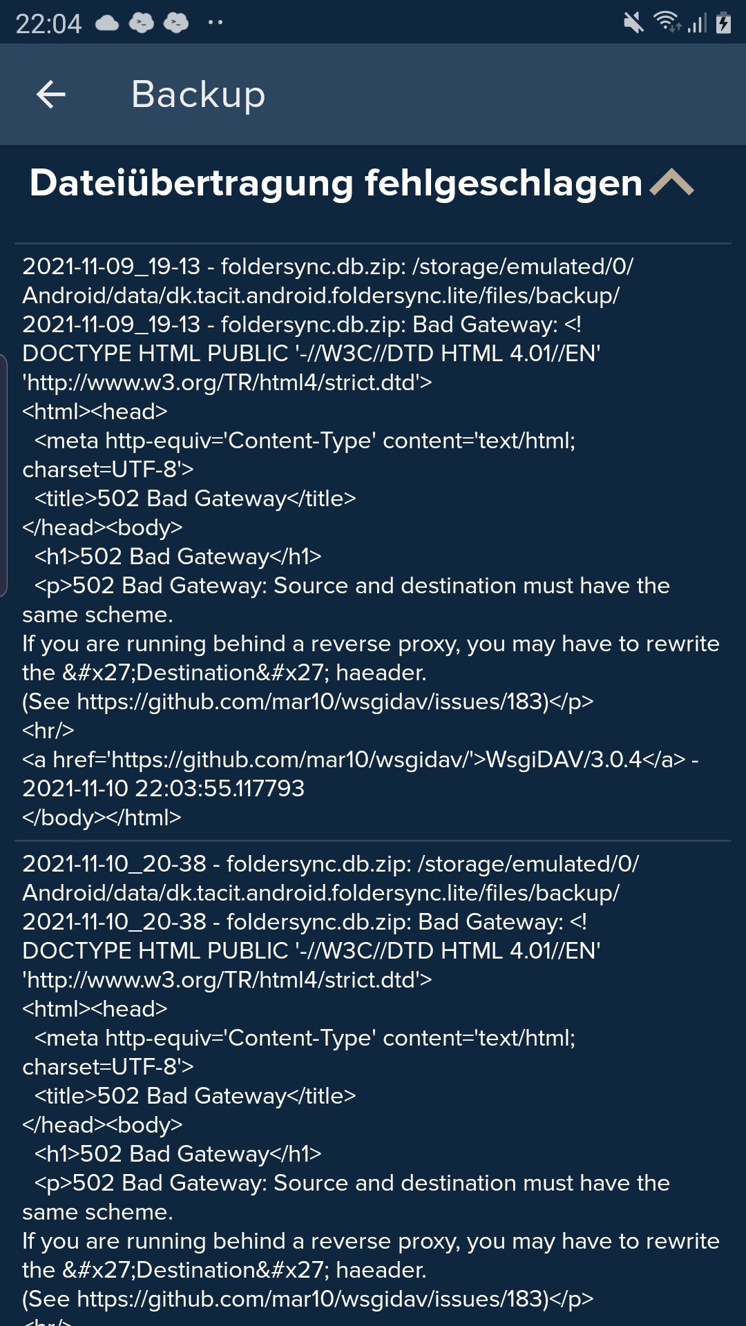 2021-04-12 21:38:43.695 - <140695106422528> wsgidav.wsgidav_app INFO : 127.0.0.1 - mail@mydomain.net - [2021-04-12 19:38:43] "MOVE /Phone/DCIM/Camera/testimage.jpg.tacitpart" dest="http:://seafile.mydomain.net/seafdav/Phone/DCIM/Camera/testimage.jpg", depth=0, overwrite=T, elap=0.045sec -> 502 Bad Gateway