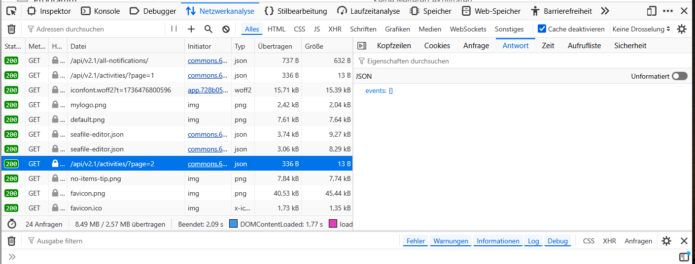 In the seahub - und seafevents.log there are no data errors or something, the seafevents looks pretty good, I think: