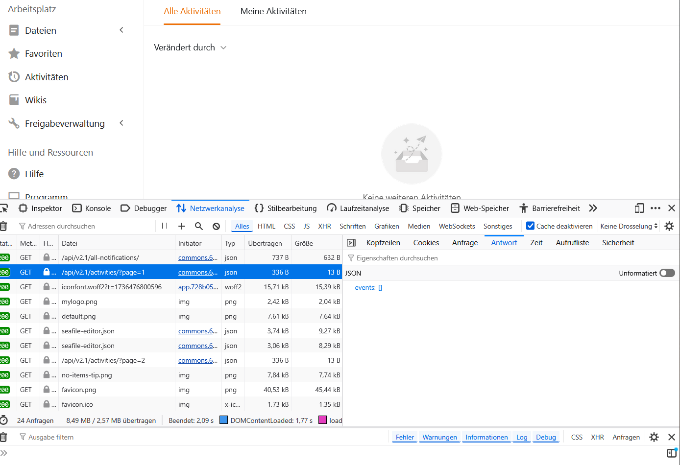 seahub.logandseafevents.log: Look for any “Incorrect string value” or “DataError” messages. In some cases, if an activity contains a special character that the Python backend fails to serialize into JSON, the entire API call might fail or return an empty set.
