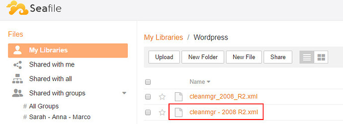 Hello, I have a private seafile 6.0.4. I upload a XML text file with spaces in the file name “cleanmgr - 2008 R2.xml”. When I try to download or preview the file, the WebView says “File does not exist”